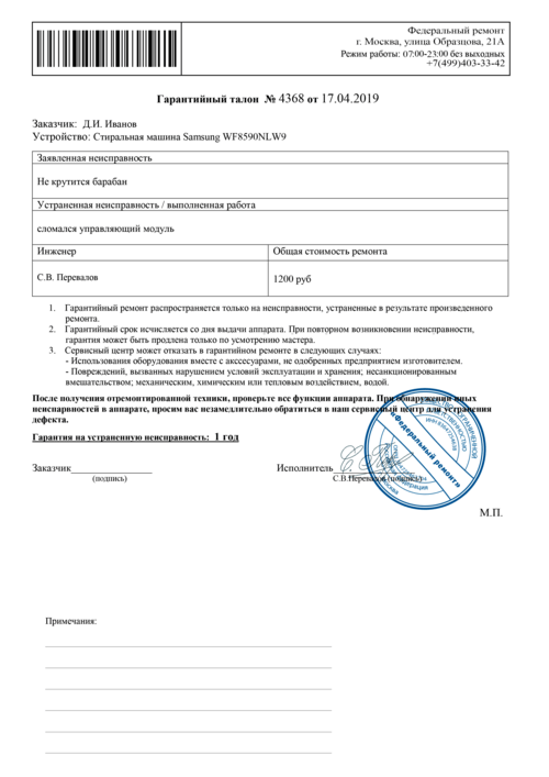 • — Гарантийный талон, с перечнем устранённых неисправностей, на которые будет действовать гарантия